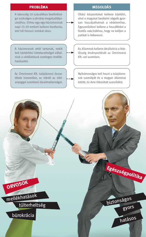 Az egészségügy vezetői közben úgy viselkednek, mintha a titokzatos tulajdonosi hátterű Omninvest Kft. az ő érdekeltségi körükbe tartozna. A pandémiás bizottság több tagja még szeptemberben azt tanácsolta a tisztifőorvosnak, hogy noha a ragály a várandósokra a legveszélyesebb, meg kell fontolni az oltásukat. Elsősorban a családtagjaikat kellene beoltani, és ha mégis megfertőződnek, vírus elleni szereket kell adni a kismamáknak. Ennek ellenére Falus Ferenc országos tisztifőorvos mégis azzal állt a nyilvánosság elé, hogy első körben az állapotos nőknek kell beadni az oltást. Majd közölték: a végső döntést a háziorvosoknak kell meghozni, amit ők úgy értelmeznek, hogy a kormány rájuk tolta a felelősséget, és az esetleges kártérítési perben nekik kell helytállniuk.