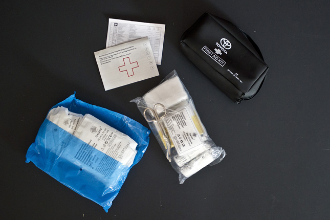 A Toyota Yaris tesztautó gyári elsősegélycsomagja hiánytalan és jó minőségű